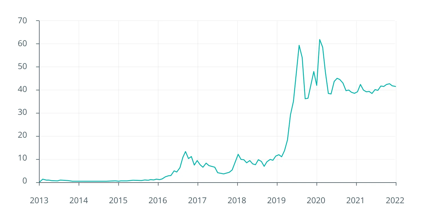 Aşağıdaki grafik, Ekim 2013’ten 16 Mart 2022’ye kadar günlük Bitcoin fiyatındaki artışı dolar cinsinden göstermektedir.