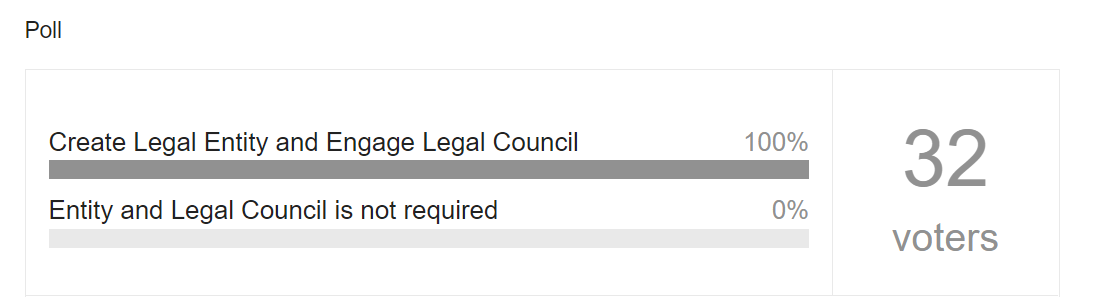 Sahipler ve katkıda bulunanlar için yasal açıklık yoluyla risk azaltma ve sorumluluk sınırlaması olasılığı göz önüne alındığında, teklif yasal yapının uygulanması için %100 oy aldı.